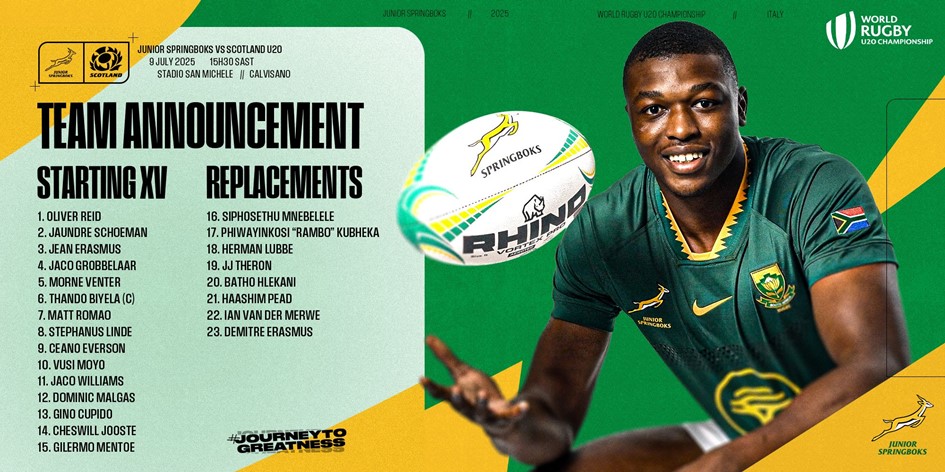 According to Kevin Foote, the Junior Springbok head coach, they’ve named a team that will play this important pool game with real purpose and pride against a very good Scotland side. A win will solidify the Junior Boks’ top spot in Pool A.