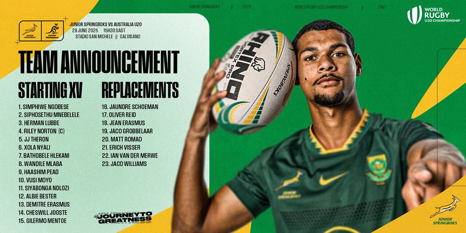The Junior Springbok starting team to take on Australia in the World Rugby U20 Championship on Sunday shows four changes from their last match in the recent U20 Rugby Championship against New Zealand.
