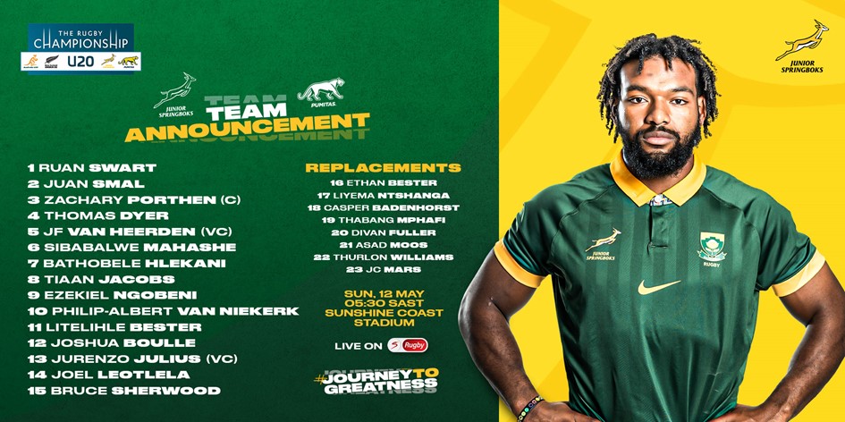 Only four players in the starting team will run out in the same positions they played against Australia – JF van Heerden (lock), who captained the SA U20s against Australia, Tiaan Jacobs (No 8), Litelihle Bester (left wing) and Jurenzo Julius (outside centre).